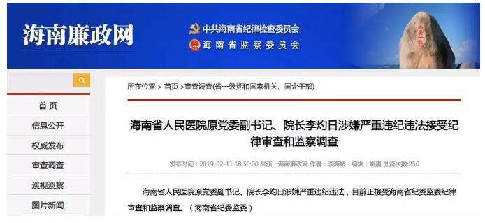 2月11日,海南省纪委监委消息,海南省人民医院原党委副书记、院长李灼日涉嫌严重违纪违法,目前正接受海南省纪委监委纪律审查和监察调查。目前关于李灼日被查的具体原因不详。