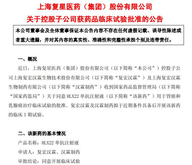 近日,上海复星医药(集团)股份有限公司控股子公司上海复宏汉霖生物技术股份有限公司(以下简称“复宏汉霖”)及上海复宏汉霖生物制药有限公司(以下简称“汉霖制药”)收到国家药品监督管理局(以下简称“国家药监局”)关于同意HLX22单抗注射液用于胃癌和乳腺癌治疗临床试验的批准。复宏汉霖及汉霖制药拟于近期条件具备后开展该新药的临床I期试验。