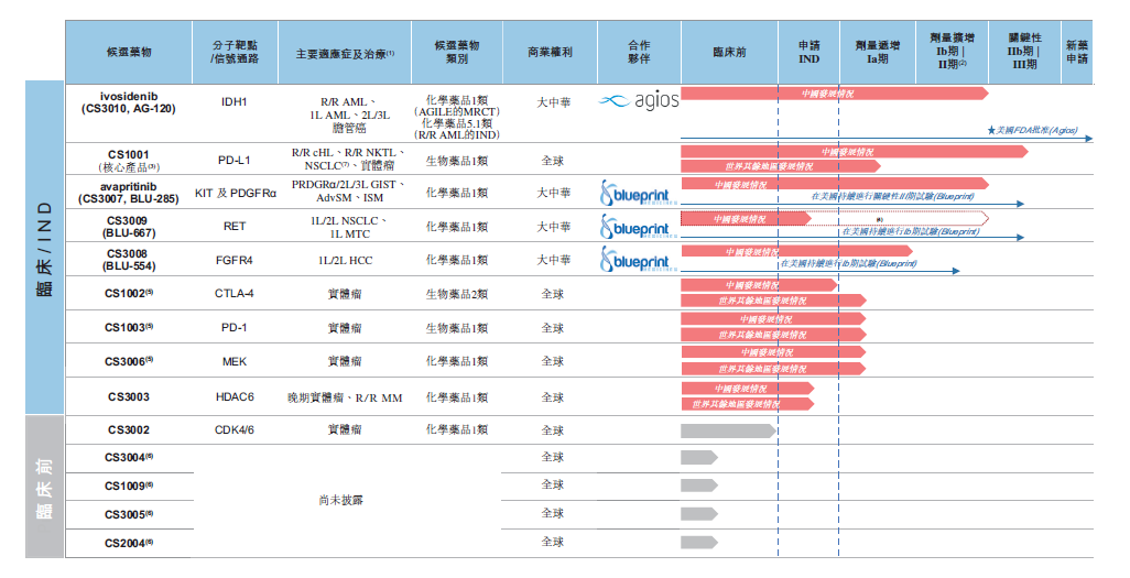 基石药业成立于2015年12月,专注于开发及商业化创新肿瘤免疫及分子靶向药物,重点方向是肿瘤免疫治疗联合疗法。目前该公司拥有 14 条药物研发管线,其中9款处于临床阶段,5款处于临床前研究阶段,包括三种处于临床阶段的肿瘤免疫治疗骨干候选药物(PD-L1、PD-1及CTLA-4抗体)。此外,已就五种候选药物递交十项IND申请,就四种候选药物取得九项IND批准,包括两项来自美国FDA,CS1001(PD-L1抗体)及CS1003(PD-1抗体)。