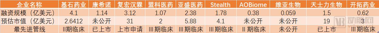 我们的数据显示,这十家企业都已经达到了以上基本门槛和标准。最低融资额是0.059亿美元,最高的一家融了4.1亿美元;最低的市值是2亿美元,最高31亿美元。在港股上市企业中,营业额和盈利数据并未做上市参考,所以,其他生物企业主要的参考标准就是市值和产品管线。以上企业中,每家企业至少有一个产品进入临床Ⅱ期,其平均市值为3.5亿美元(由于大部分初创企业市值难以达到复宏汉霖和天士力生物的规模,故暂将其排除),或许这将为当前赴港上市生物技术企业提供市值规模的参考。