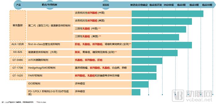 开拓药业成立于2009年,是一家立足中国、面向全球、新药研发公司。目前公司主要深耕前列腺癌、乳腺癌和肝癌三大癌症,专注发展“best-in-class”和“first-in-class”创新药物研发及产业化平台。从研发管线来看,开拓药业主营自主产品的1.1类小分子创新药。主要产品普鲁克胺目前已经进入II期临床,并在中美两地都同步展开。