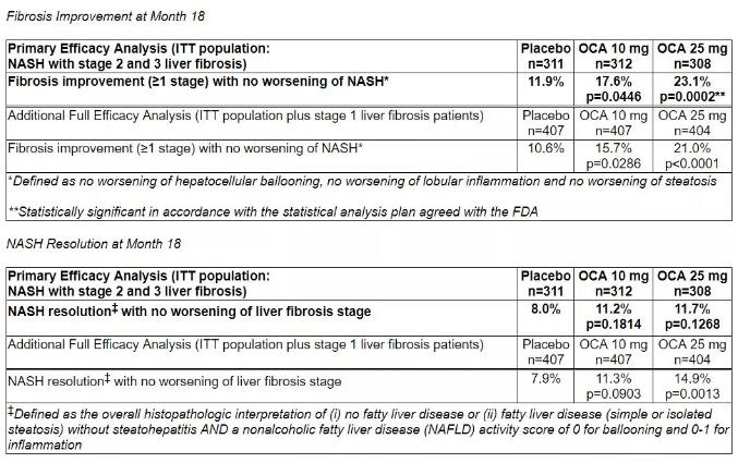本次临床试验的结果进一步证实了这一潜力。在这项随机双盲、含安慰剂对照的多中心试验中,931名出现2级或3级肝脏纤维化的NASH患者分为三组,分别接受了不同剂量的OCA(10 mg或25 mg)或安慰剂的治疗。截至中期数据分析时,试验结果表明,在接受治疗18个月之后,每日一次OCA(25 mg)达到了试验的主要终点:与安慰剂相比,显着改善患者的肝脏纤维化程度(纤维化程度改善超过1级,p=0.0002)。同时,患者的NASH症状没有出现显着恶化。