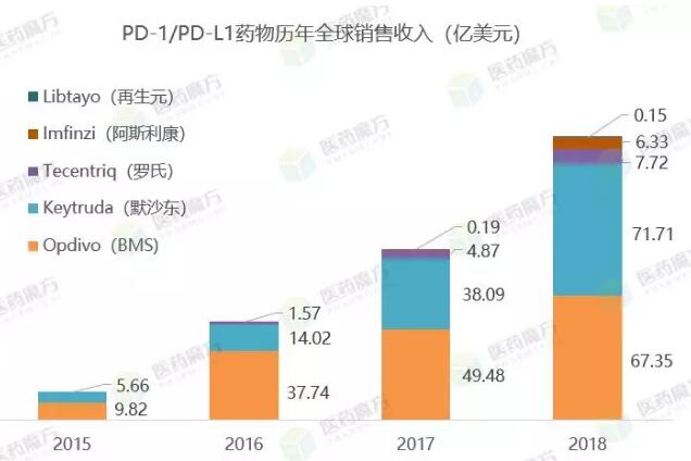 2014年Opdivo率先在日本获批上市,标志着肿瘤免疫治疗进入新纪元。截至今天,短短5年内全球已经批准了8款PD-1/PD-L1药物上市,而这类药物的市场规模也从0迅速扩容到超过150亿美元(未统计Ono销售收入)。