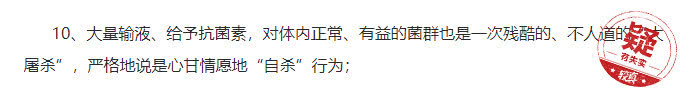 如前述,输液用药不仅有抗生素药物,还有解热镇痛药、营养药物等各种药物。使用抗生素的确会灭杀人体内正常有益菌群,但使用抗生素之前一定是病人有用药的适应症,医生评估用药的受益大于损失,才会开具处方,怎么能谈得上是自杀行为。