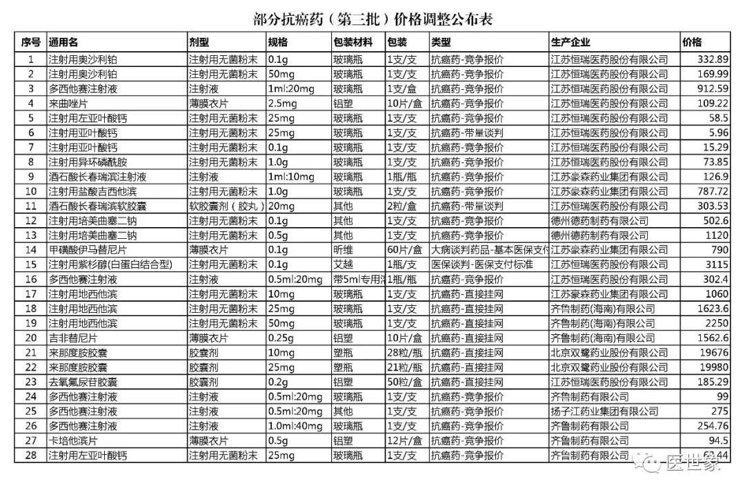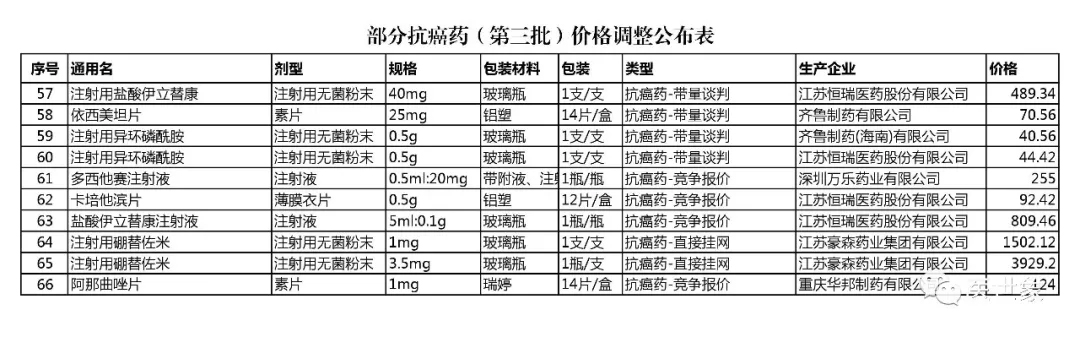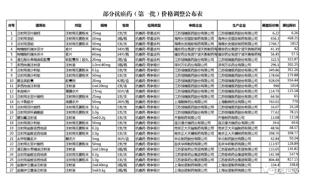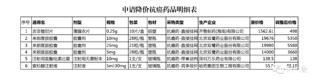 第四批申请降价抗癌药物明细表,申请公示和正式公布的药品清单基本一致。