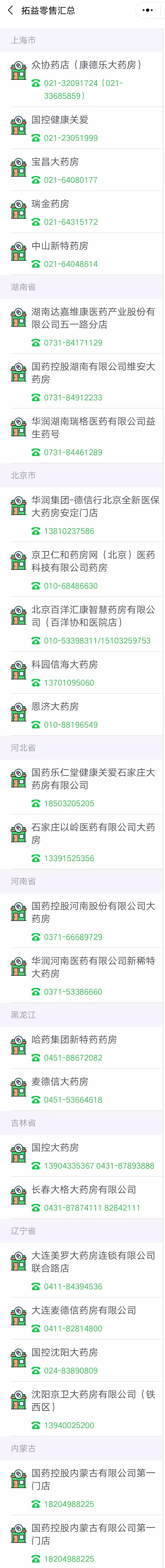 同时,拓益的购药地点信息也已公布,其将在全国30个省市51座城市共同销售。