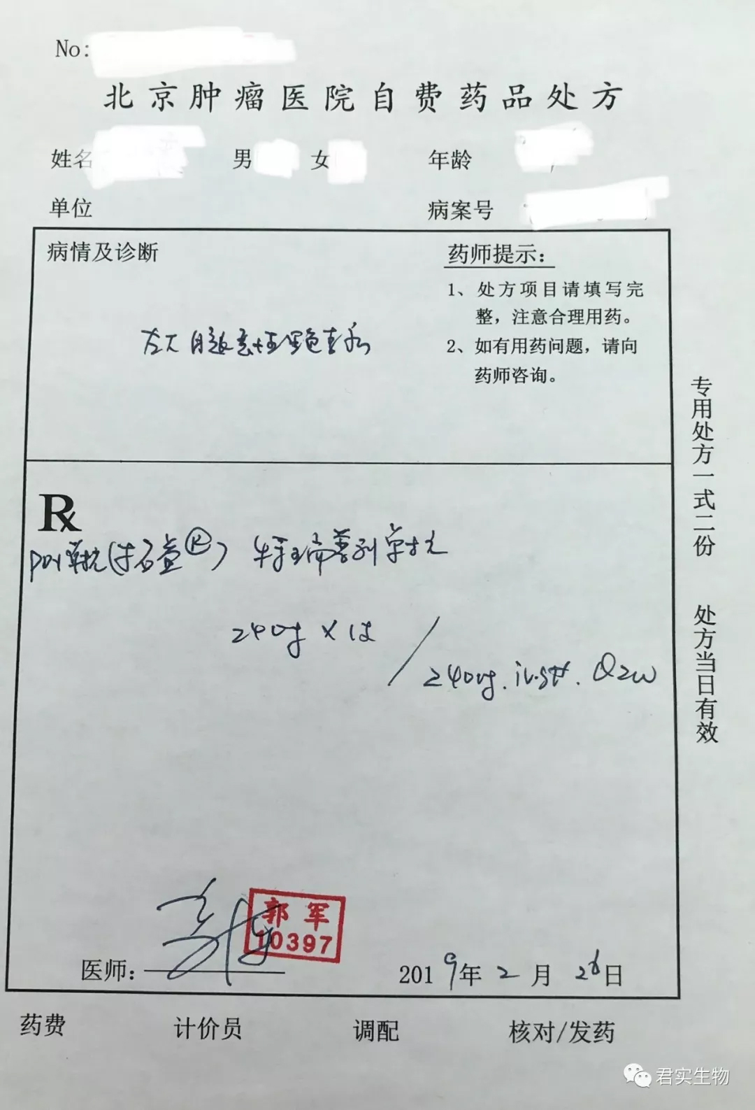根据君实生物官微消息,昨日(2月26日),其首个国产PD-1药物特瑞普利单抗注射液(商品名:拓益)已开出首张处方,该处方由北京大学肿瘤医院开出。