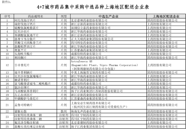 附件3:4+7城市药品集中采购中选品种上海地区配送企业表