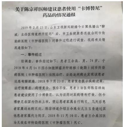 同时,聊城卫健委作出《关于陈宗祥医师建议患者使用“卡博替尼”药品的情况通报》,公布了事情过程的调查结果,对该医师责令暂停一年执业活动的处罚,并给予行政警告处分,免去科主任职务等。