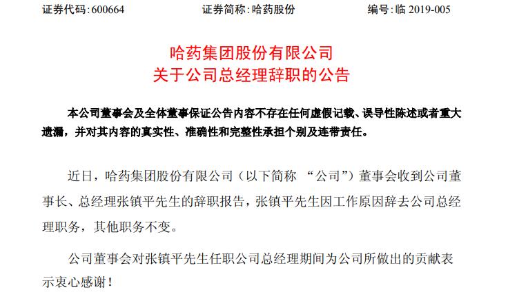 《哈药集团股份有限公司关于公司总经理辞职的公告》中显示,公司董事会近日收到公司董事长、总经理张镇平的辞职报告。因工作原因,张镇平辞去公司总经理职务,其他职务不变。