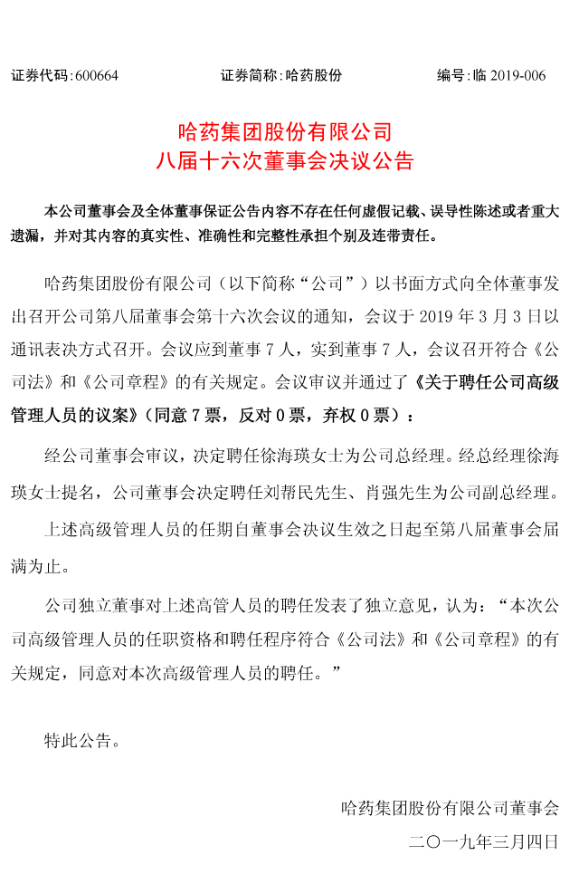 在披露张镇平辞去总经理一职的同时,《哈药集团股份有限公司八届十六次董事会决议公告》中称,公司于3月3日以书面方式召开第八届董事会第十六次会议经该公司董事会审议,经公司董事会审议,决定聘任徐海瑛女士为总经理。经总经理徐海瑛女士提名,该公司董事会决定聘任刘帮民先生、肖强先生为公司副总经理。