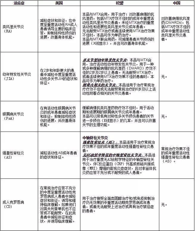 表1 修美乐在美国、欧盟和国内批准的适应症
