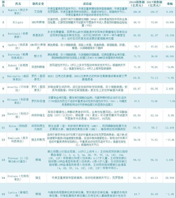 位居榜首的依然是“常胜军”Humira(修美乐),其次是抗凝药物Eliquis。值得注意的是,15款药物中有6款药物适用于癌症治疗,包括两款热门的PD-1药物Keytruda和Opdivo。