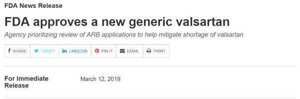 “我们了解到进行中的药品召回是为了防止某些杂质危害服用缬沙坦患者的健康,但这也同时导致了重要药物发生短缺,”即将离任的FDA局长Scott Gottlieb医学博士表示,“因此,要解决这些问题的公共卫生后果,在药品短缺方面,我们优先考虑对缬沙坦产品的仿制药申请进行审查。当面临药物短缺情况时,FDA采用了许多策略来帮助缓解其对患者的影响。作为该工作的一部分,我们将研究可以在哪些方面对短缺药物或类似产品的申请进行优先审查。希望今天批准这种新的仿制药有助于减少缬沙坦的短缺。”