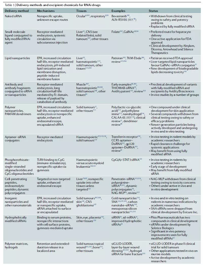 dsRNA触发器的化学修饰、大小、亲水性和电荷都对系统循环、外渗、组织渗透、细胞摄取以及内涵体逃逸构成了重大挑战。许多化学赋形剂(辅料)已被开发出来以克服这些障碍,包括纳米颗粒、脂质纳米颗粒(LNPs)、聚合物、树状大分子、核酸纳米结构、外泌体和GalNAc偶联蜂毒素样肽(NAGMLPs)。siRNA常见的靶向配体包括适配体、抗体、多肽和小分子(如GalNAc)(表1)。