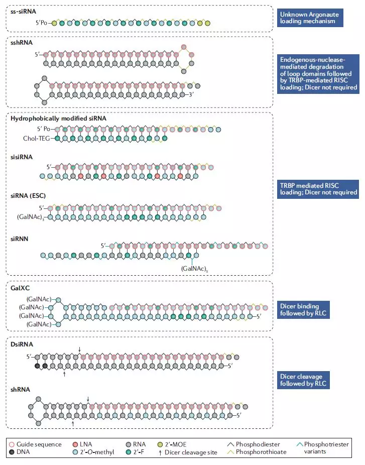 图4 不同类型的合成RNAi触发器具有代表性的二级结构基序以及它们进入RNAi通路的主要机制。(图片来源:Nature Reviews Drug Discovery)