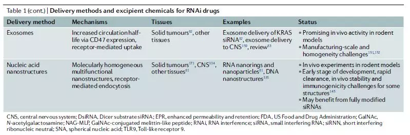 表1 RNAi药物的递送方法以及赋形剂