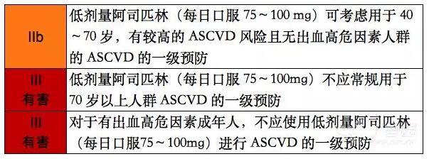 1)对于心血管事件风险较高且不具有出血高危因素的 40~70 岁患者,可以考虑应用小剂量阿司匹林(75~100mg/d),但仅为 IIb 级推荐(即可用、可不用但倾向于不用)。