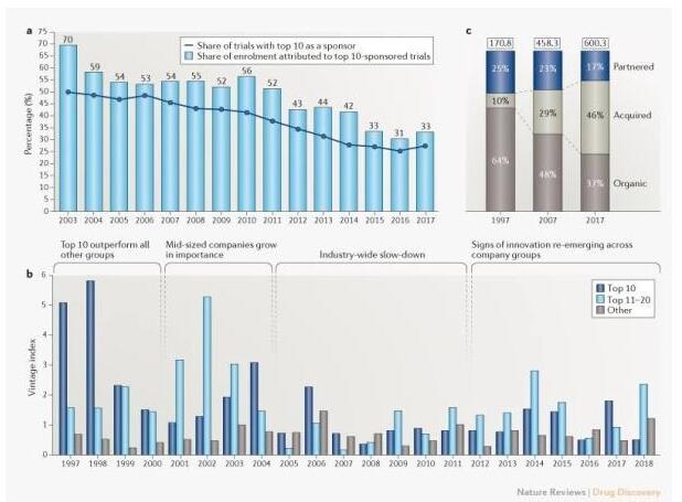 进一步深入观察新产品及其收入的趋势可以了解到,在20世纪90年代,前十大公司中获得美国FDA批准的新药份额超过50%。此后,这一比例稳步下降,过去3年内已经跌至26%。医药总收入中来自外部来源的利润份额也在逐年增长(见图2c),1997年收购获得药品的收入占药品总销售额的10%,而2017年则大幅上升至45%。