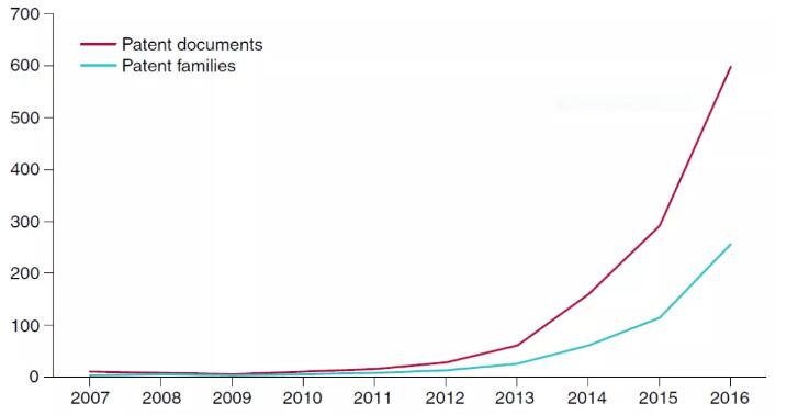 从时间上看,与CAR-T细胞疗法相关的专利文件自2013年以来呈井喷趋势,从2013年的60份(25个专利家族)上升到2016年的597份(255个专利家族)。