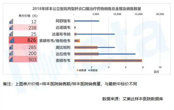 市场表现方面,“吉一代”索磷布韦表现最佳,在2018年样本公立医院中销售总金额790万元,其次为施贵宝的达拉他韦和艾伯维的奥比帕利,分别为285万元和270万元,均是联合用药。单药治疗药物中唯一有销售体现的是索磷布韦/维帕他韦,于在2018年5月上市,已有不俗的市场表现,尽管其单片价格最高,但仍然抵挡不住市场的认可。