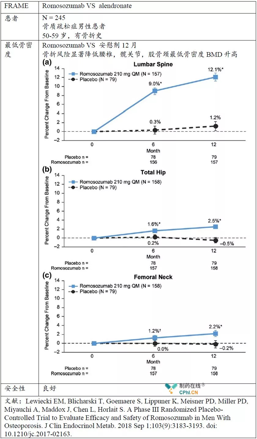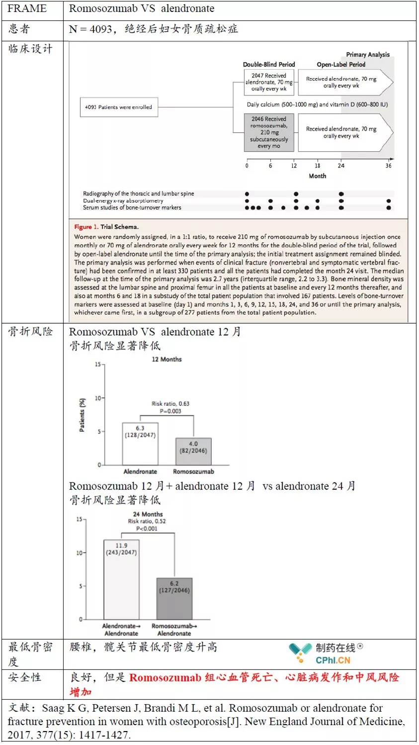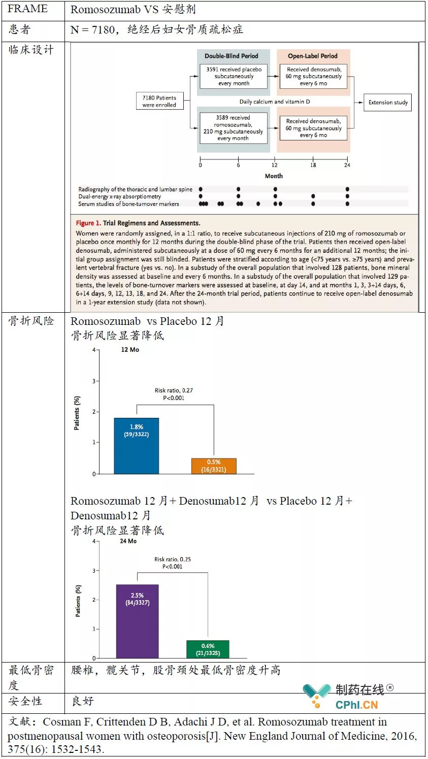 FRAME招募7180例绝经后妇女骨质疏松症患者,国际多中心、随机、安慰剂对照3期临床试验。评估Romosozumab对骨质疏松患者的安全性和有效性。