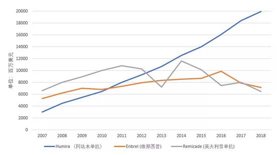 Enbrel (依那西普)是第一个批准用于RA的TNF拮抗剂,安进和辉瑞分别2002年和2009年通过收购依那西普的原开发公司Immunex和惠氏,获得了共同商业化权利,安进负责依那西普在美国和加拿大市场的销售,而辉瑞负责依那西普在美国和加拿大以外地区的销售。但依那西普欧盟专利已在2015年过期,2018年辉瑞公布的Enbrel销售额只有安进负责的北美市场的一半。