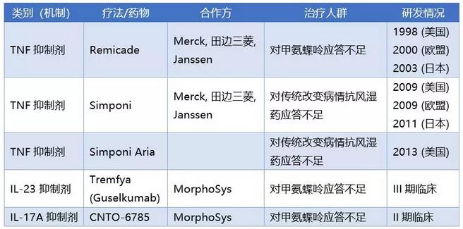 以上公司均有RA药物上市,占据了不小的市场份额,并且研发管线中有新产品