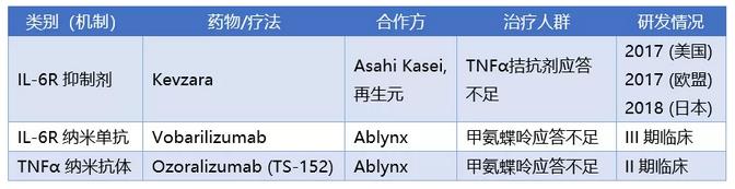 Ablynx带来的TNF-α 纳米抗体Ozoralizumab目前处于II期临床,优势在于增强TNFa靶向性和和延长药物在体内的半衰期,中国和日本开发和商业化分别在2014和2015年授予亿腾医药和Taisho。