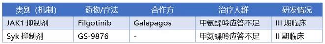 Filgotinib在代号为FINCH1和FINCH3的III期临床试验中达到主要终点。从已完成的临床试验结果来看,Filgotinib比JAK抑制剂前辈们具有更好的安全性,特别是在严重感染和静脉血栓方面更优。Gilead另一个II期药物为脾酪氨酸激酶抑制剂GS-9876,同时也开启了GS-9876+ Filgotinib联用于RA的试验。