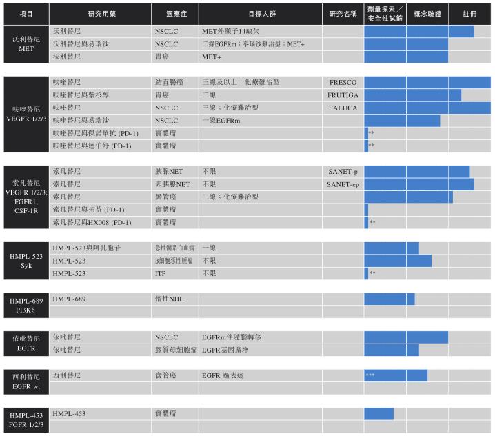 和黄中国医药科技的行政总裁贺隽表示:“我们高效的研发平台拥有400多位世界级人员的科研团队,产品管线有八个肿瘤治疗临床候选药物,目前正在中国及全球进行30多项临床试验。继我们的靶向治疗药物爱优特(呋喹替尼胶囊)于2018年在中国销售用于治疗结直肠癌,我们希望另外两个肿瘤治疗药物,沃利替尼和索凡替尼,若临床研究结果理想,可于未来两年内获批上市。我们的上市计划加上我们强大的研发平台将有助于我们进一步巩固在中国肿瘤治疗行业的领导地位,并加快我们的重点候选药物在全球的发展。”