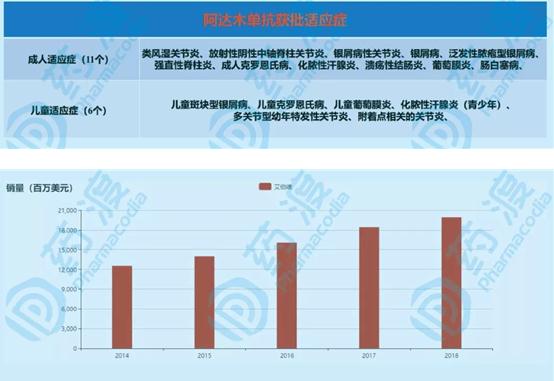 市场:艾伯维研发的修美乐(阿达木单抗)是全球首个获批的全人源抗肿瘤坏死因子(TNF-α)单抗,对类风湿关节炎、强直性脊柱炎、银屑病、克罗恩氏病等多种自身免疫性疾病都显示出显着的疗效,迅速取代了糖皮质激素、非甾体抗炎药成为了临床的首选。凭借临床的优势,阿达木单抗已经拿下了17个自身免疫疾病适应症,自2012年以92.65亿美元销售额首次问鼎全球药品冠军后,就一直保持着高速的增长速度。2018年更是拿下了199.36亿美元的成绩,比肿瘤市场最火爆的Opdivo、Keytruda销量总和还多了五十亿美元,市场号召力无出其右。