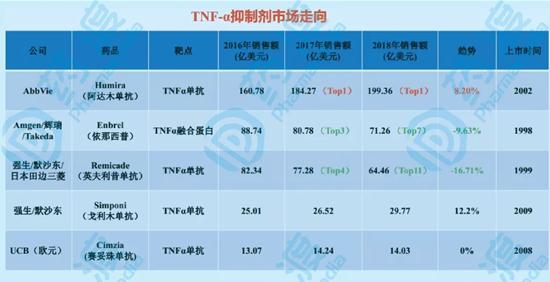 TNF-α抑制剂适应症横跨自身免疫十几个亚病种,在阿达木单抗引领下,当仁不让成为了自身免疫市场上的王者。2018年五款TNFα单抗合计销售为380亿美元,不过专利到期、非TNFα单抗的强势崛起,TNFα单抗内忧外患,尽显疲态。