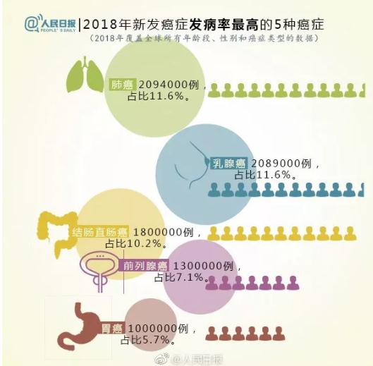 全球2018年新发癌症发病率TOP5。|图:微博 @人民日报