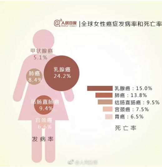 2018年全球女性癌症发病率和死亡率。|图:微博 @人民日报
