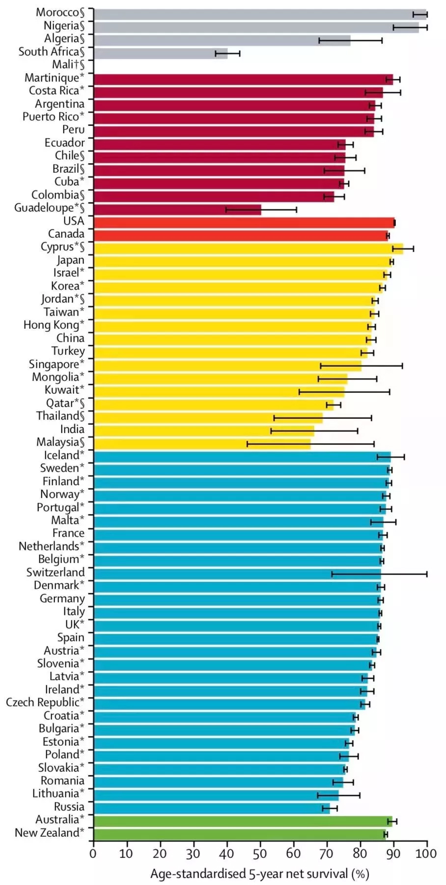 不同国家乳腺癌的5年生存状况,灰色代表非洲,深红色代表南美洲,红色代表北美洲,黄色代表亚洲,蓝色代表欧洲,绿色代表澳洲。|图:柳叶刀,《2000-2014年全球癌症生存趋势监测报告》