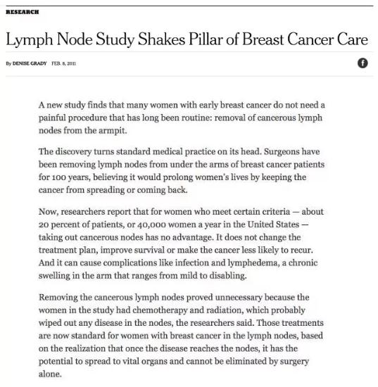 2011年,《纽约时报》刊登文章《撼动乳腺癌治疗理念的淋巴结研究》,展示Armando Giuliano博士的研究成果。|资料图片