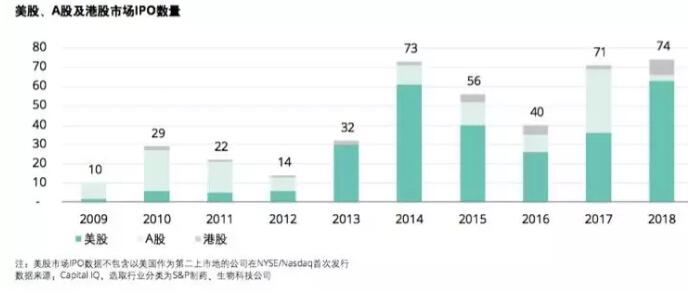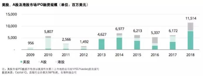 一方面,医药及生物科技企业IPO持续增长。以美股、A股及港股市场口径计,2018年全球医药及生物科技行业通过IPO的企业共计74家,募集资金总额达115亿美元,两项数据均创十年来新高,2019年开年以来势头未减。