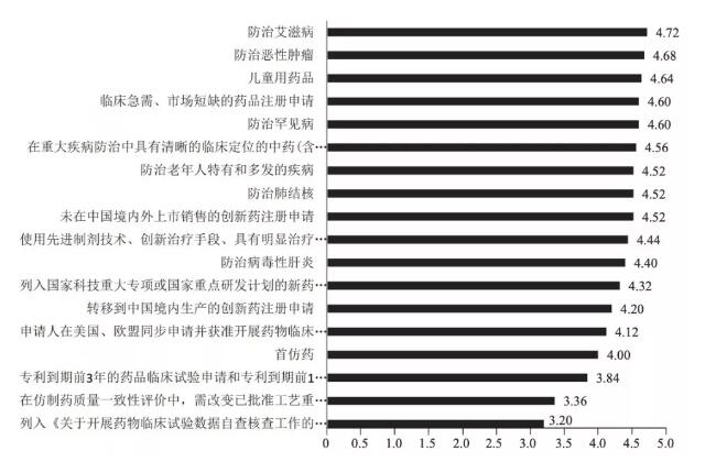 调查显示,18 种药物类型平均得分为 4.29 分, 其中防治艾滋病、恶性肿瘤等重大疾病药品的优先 审评必要性最高,为仿制药一致性评价、临床自查 核查工作 ( 最下方两项 ) 开辟通道的必要性最低。由此可见,在药品注册积压已经得到有效缓解的背景下,优先审评药品范围应当回归本源,重视药品 的临床价值与临床需求,加快临床有需要品种上市。