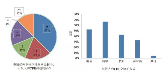 调查显示,37.5%的申报人与药审中心没有沟通,18.75%的申报人与药审中心沟通过1次,12.5%的申报人与药审中心沟通过2次,18.75%的申报人与药审中心沟通过3次,沟通超过4次以上的申报人占12.5%。沟通方式上,只有三分之一的申报人通过面对面的方式与药审中心交流,大多数沟通方式仍然以电话、网络、书面为主。
