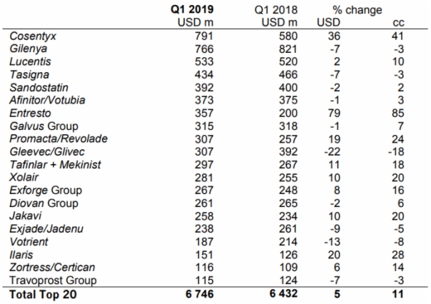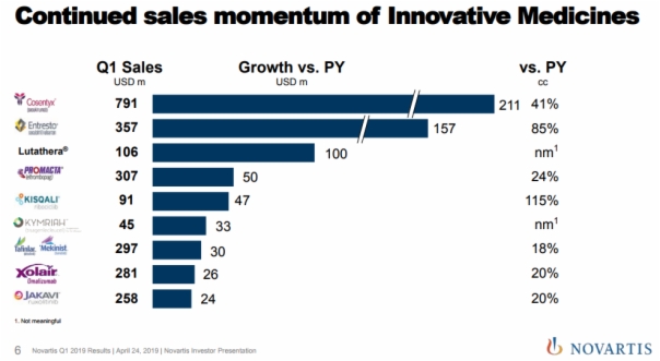 诺华近日发布2019年第一季度财务报告,持续经营净销售总额111.06亿美元(+7%),市场容量增长11%,主要来自Cosentyx(+41%)、Entresto(+85%)、Lutathera(nm)、Promacta(24%)、Kisqali(115%);营业收入22亿美元(+4%),净收入19亿美元(+4%)。核心营业收入33亿美元(+18%),主要是受创新药物销售增长的毛利率提高驱动,部分被增加的和启动的投资抵消;核心净收入为28亿美元(+13%)。自由现金流为19亿美元,与去年持平。