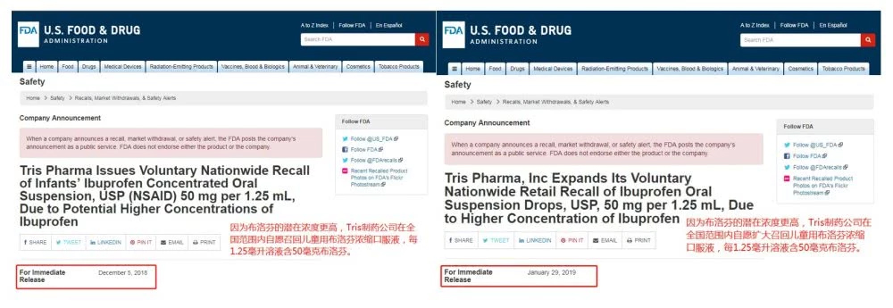 首先,召回事件并不是发生在最近,而且发生了两次,分别是在2018年12月5日和2019年1月29日。这两起召回事件均由美国Tris Pharma公司发起,并在其公司网站上发布了召回公告,其中前者是Tris公司发布的自愿召回公告,后者是Tris公司发布了扩大召回公告[1]。为了服务公众,美国食品药品监督管理局在其官网上也发布了Tris公司的这两起召回公告[2,3]。