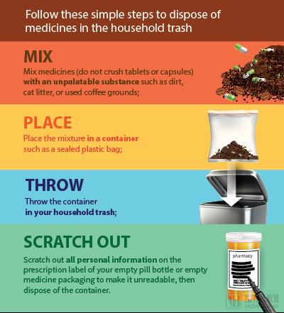 如果消费者所在地没有回收活动,也未设永久药物回收站,且药物的说明书中并没有说明特定的处理方式,消费者可以通过简单的处理之后,作为家庭垃圾丢弃。具体的处理方式是:胶囊剂、片剂、胶囊等药物不要压碎,与灰尘、猫砂或咖啡渣混合丢弃;粉状药物可放入密封塑料袋或密封容器中丢入垃圾桶;药品口服液、空药瓶等药物容器应撕下标签中的个人信息以及处方编号,然后直接丢弃。