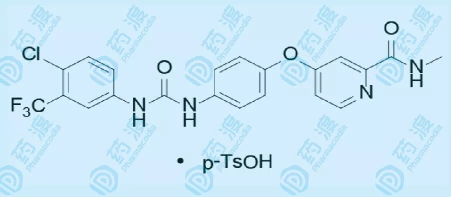 索拉非尼:索拉非尼是一种口服的小分子化合物,除了抑制多种酪氨酸激酶受体(包括VEGFR-2、VEGFR-3、PDGFR-β、c-KITRC1等)发挥其抗肿瘤作用外,还可抑制Raf下游的丝/苏氨酸激酶活性,阻断在细胞增殖中起重要作用的MAPK通路,从而同时影响肿瘤的血管发生和细胞增殖。2005年12月FDA正式批准索拉非尼用于晚期肾癌的治疗,是世界上第一个上市的口服多激酶抑制剂,由拜耳上市销售。
