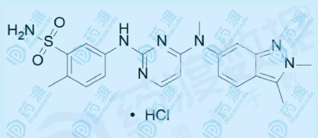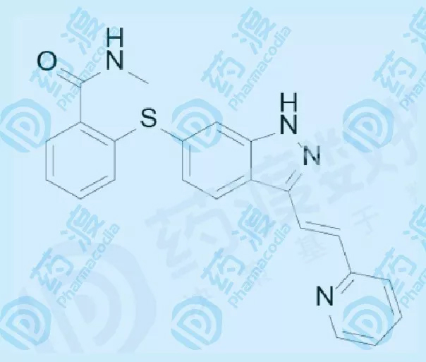 帕唑帕尼:帕唑帕尼是一种口服的多靶点酪氨酸激酶抑制剂,能够阻断包括VEGFR1-3、PDGFR-α、PDGFR-β和c-KIT在内的多种受体,其作用机制与索拉非尼和舒尼替尼十分相似。2009年10月FDA正式批准帕唑帕尼用于晚期肾癌的一线治疗药物,随着诺华收购葛兰素史克抗肿瘤药物部门,现在由诺华负责上市销售。