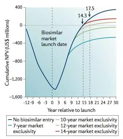 杜克大学Henry Grabowski教授建立了盈亏模型计算生物制品的数据保护期限,他认为数据保护期限应当以保障生物创新药收回研发投入成本为依据,如果设置12年的数据保护期,生物创新药实现盈亏平衡大致需要17.5年,而如果设置14年的数据保护期,生物创新药实现盈亏平衡需要的时间大致为15年(见下图)[4]。