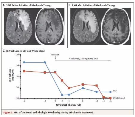 由于缺乏可使免疫功能恢复的治疗方法,且患者T细胞存在显着的PD-1表达,科学家们选择了O药进行治疗,剂量为每2周注射240 mg。O药治疗2周后,患者脑脊液JCV载量下降至200拷贝/毫升。O药治疗8周后,患者的神经系统症状和迹象稳定下来,随后她的警觉性有所改善,上睑下垂和偏瘫有所减轻。