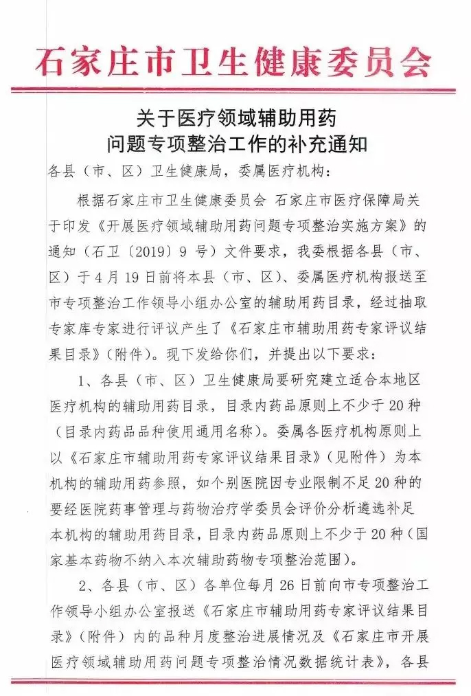 虽然,全国目录还没有发布,但辅助用药的整治风暴已经来了。可以看到,就在石家庄辅助用药目录流传的同时,该市大医院已经对相关工作进行了部署。