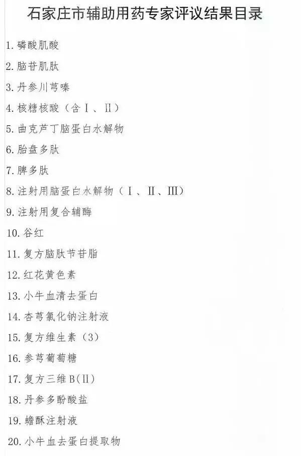 近日,石家庄卫健委发布的《关于医疗领域辅助用药问题专项整治工作的补充通知》在业界流传。随通知一起流出的还有《石家庄市辅助用药专家评议结果目录》,涉及20个品种,包括磷酸肌酸、脑苷肌肽、丹参川弓嗪等。