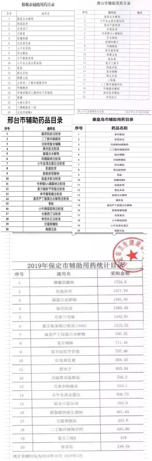 同步,邯郸、邢台、唐山、秦皇岛、保定等城市的辅助用药目录也相继流出。